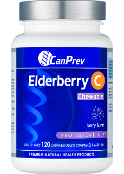 CanPrev’s Elderberry C Chewable tablet is formulated with pure European black Elderberry extract, plus plenty of vitamin C. A serving delivers 14% anthocyanins and brings with it the immune care you might need to help relieve cold and flu symptoms like fever, cough, sore throat, or upper respiratory ailments. Elderberries are a rich source of phenolic acid, flavonols, and anthocyanins – powerful antioxidants good for our daily health. Likewise, vitamin C aids in the production of white blood cells, which work to protect the body against infection while acting as an antioxidant capable of preventing oxidative stress. Elderberry C Chewables are formulated by CanPrev with a natural Berry Burst flavour suitable for ages 3 and up.