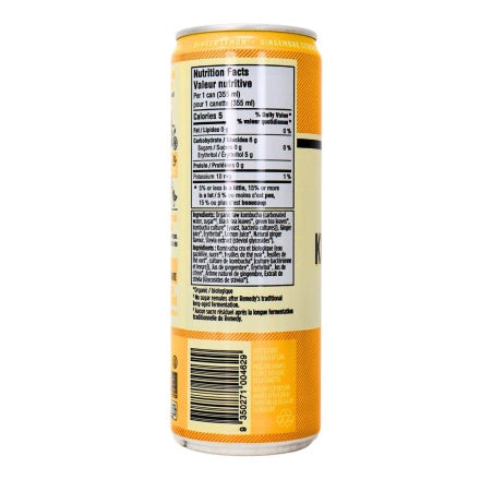 Organic raw kombucha (carbonated water, sugar*†, black tea leaves*, green tea leaves*, kombucha culture [yeast, bacteria cultures]), Ginger juice*, Erythritol, Lemon juice*, Natural ginger flavour, Stevia extract (steviol glycosides*).
