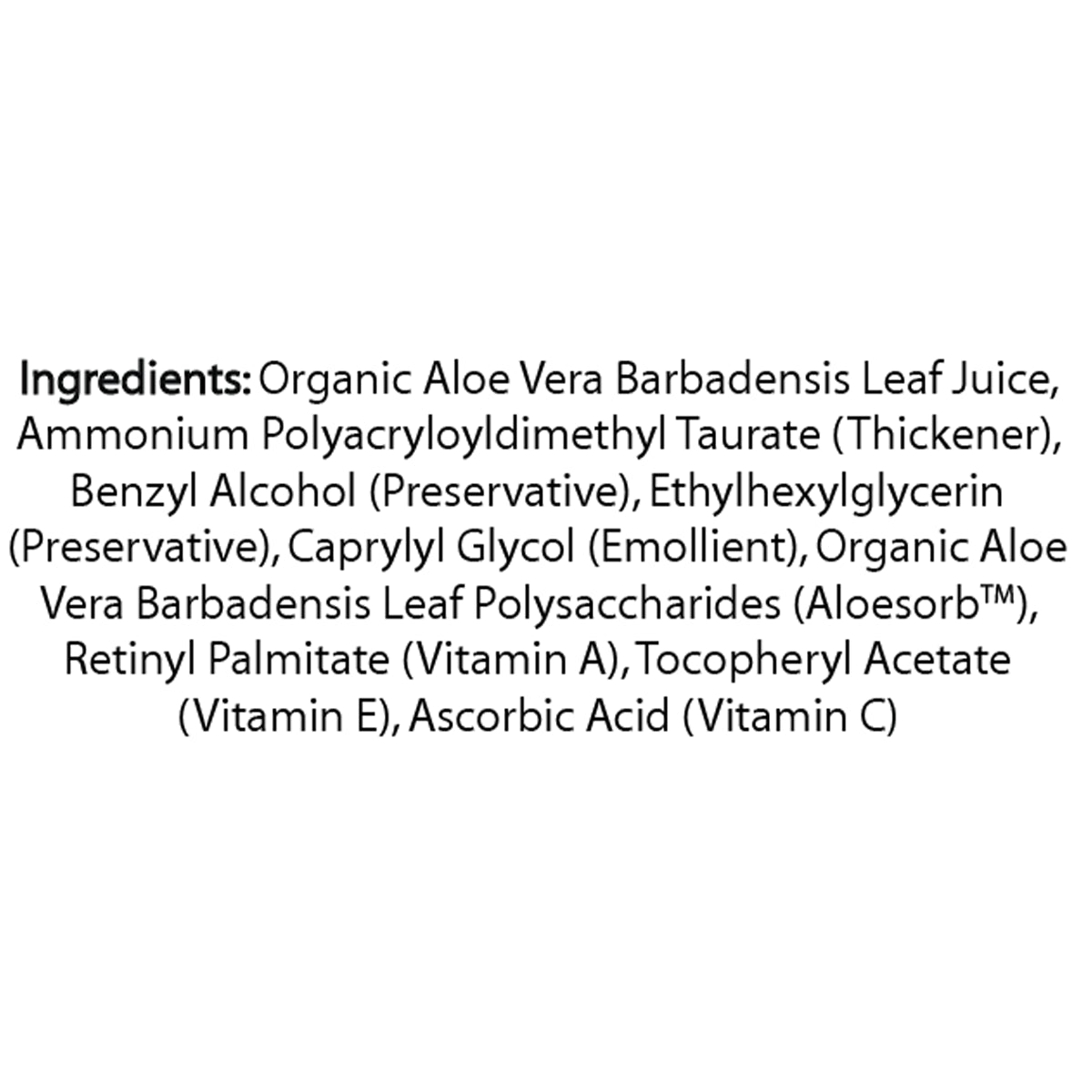 Organic Aloe Vera Barbadensis Leaf Juice, Ammonium Polyacryloyldimethyl Taurate (Thickener), Benzyl Alcohol (Preservative), Ethylhexylglycerin (Preservative), Caprylyl Glycol (Emollient), Organic Aloe Vera Barbadensis Leaf Polysaccharides (Aloesorb M), Retinyl Palmitate (Vitamin A), Tocopheryl Acetate (Vitamin E), Ascorbic Acid (Vitamin C).