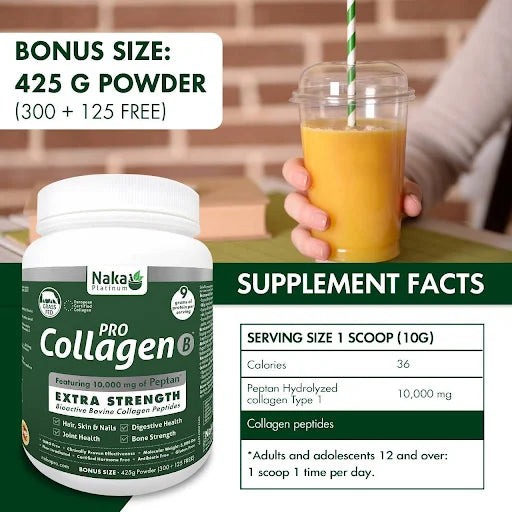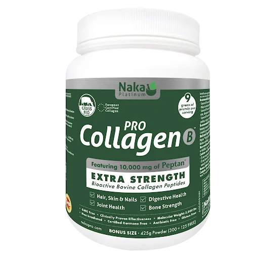Naka Collagen Bovine Extra Strength 425g Wrinkle resistance Ease joint pain and inflammation Helps support bone density Supports healthy skin, hair & nails Naka Pro Platinum Bovine Collagen helps the body metabolize carbohydrates, fats and proteins. Helps in the development and maintenance of bones, cartilage, teeth and gums. Featuring 10,000 mg of bioactive bovine collagen peptides.