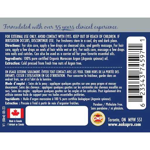 NAKA PLATINUM - Pure Moroccan Argan Oil - 60 Millilitre(s) Naka Platinum Pure Moroccan Argan Oil can be used for skin care, apply a few drops on cleansed skin, and gently massage. For hair care, apply a few drops on ends of hair while wet or dry. For nails care, massage a few drops into nails and cuticles. Can also be used as a carrier oil for your favorite essential oils. DIRECTIONS & USEFor skin care, apply a few drops on cleansed skin, and gently massage. For hair care, apply a few drops on ends of hair while wet or dry.For nails care, massage a few drops into nails and cuticles. INGREDIENTS100% Argan Oil DISCLAIMERThe information and product descriptions appearing on this website are for information purposes only, and are not intended to provide or replace medical advice to individuals from a qualified health care professional. Consult with your physician or health practitioner, if you have any health concerns, and before initiating any new diet, exercise, supplement, or other lifestyle changes.